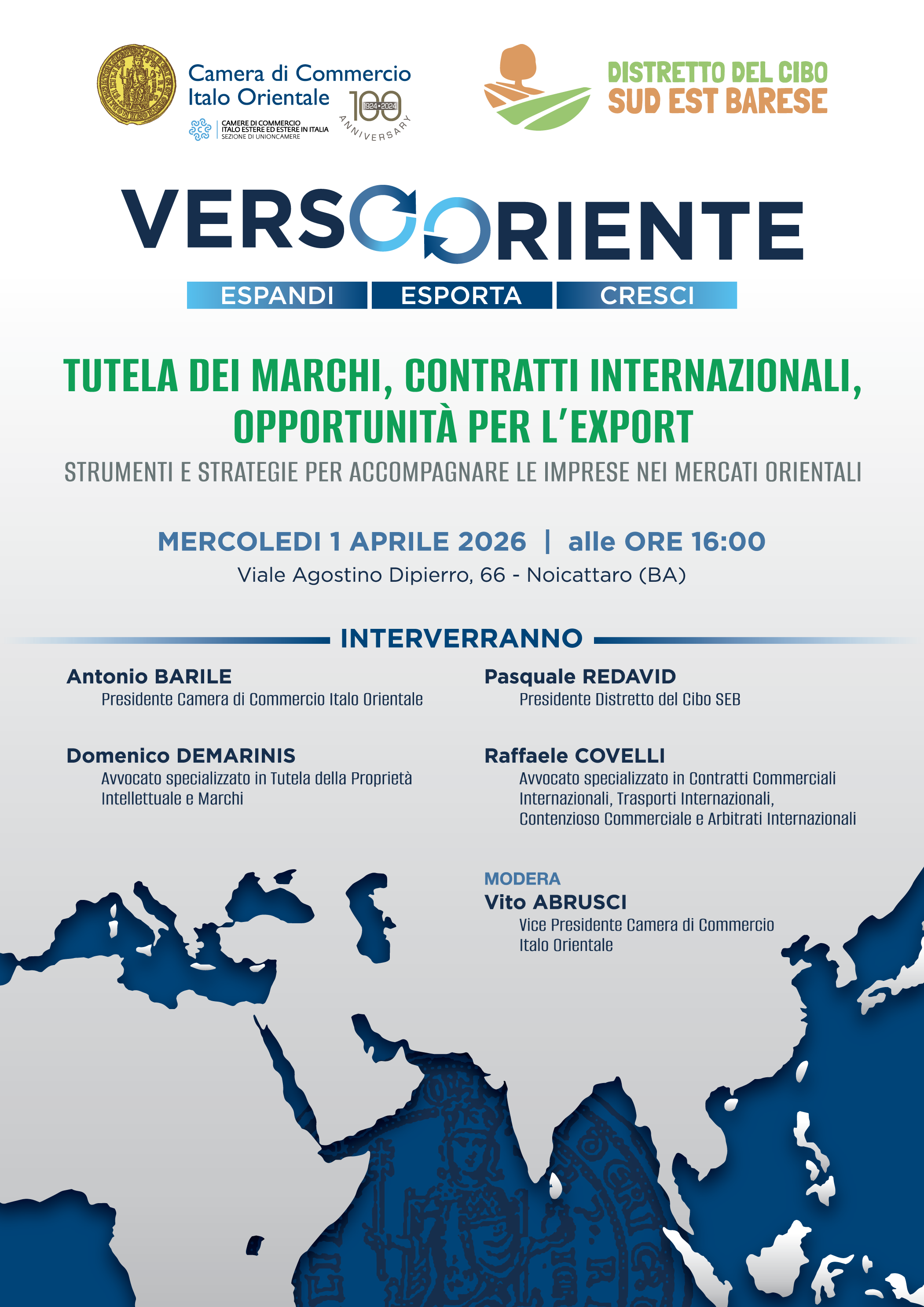 Dopo i saluti istituzionali curati dal Presidente della Camera di Commercio Italo Orientale, Antonio Barile, dal Vice Presidente, Vito Abrusci e del Presidente del Distretto Cibo Sud Est Barese, Pasquale Redavid, sono seguiti due interventi a cura di Domenico Demarinis, Avvocato specializzato nella tutela della proprietà intellettuale e dei marchi e di Raffaele Covelli, Avvocato specializzato in contrattualistica commerciale internazionale, trasporti internazionale, contenzioso e arbitrati internazionali.